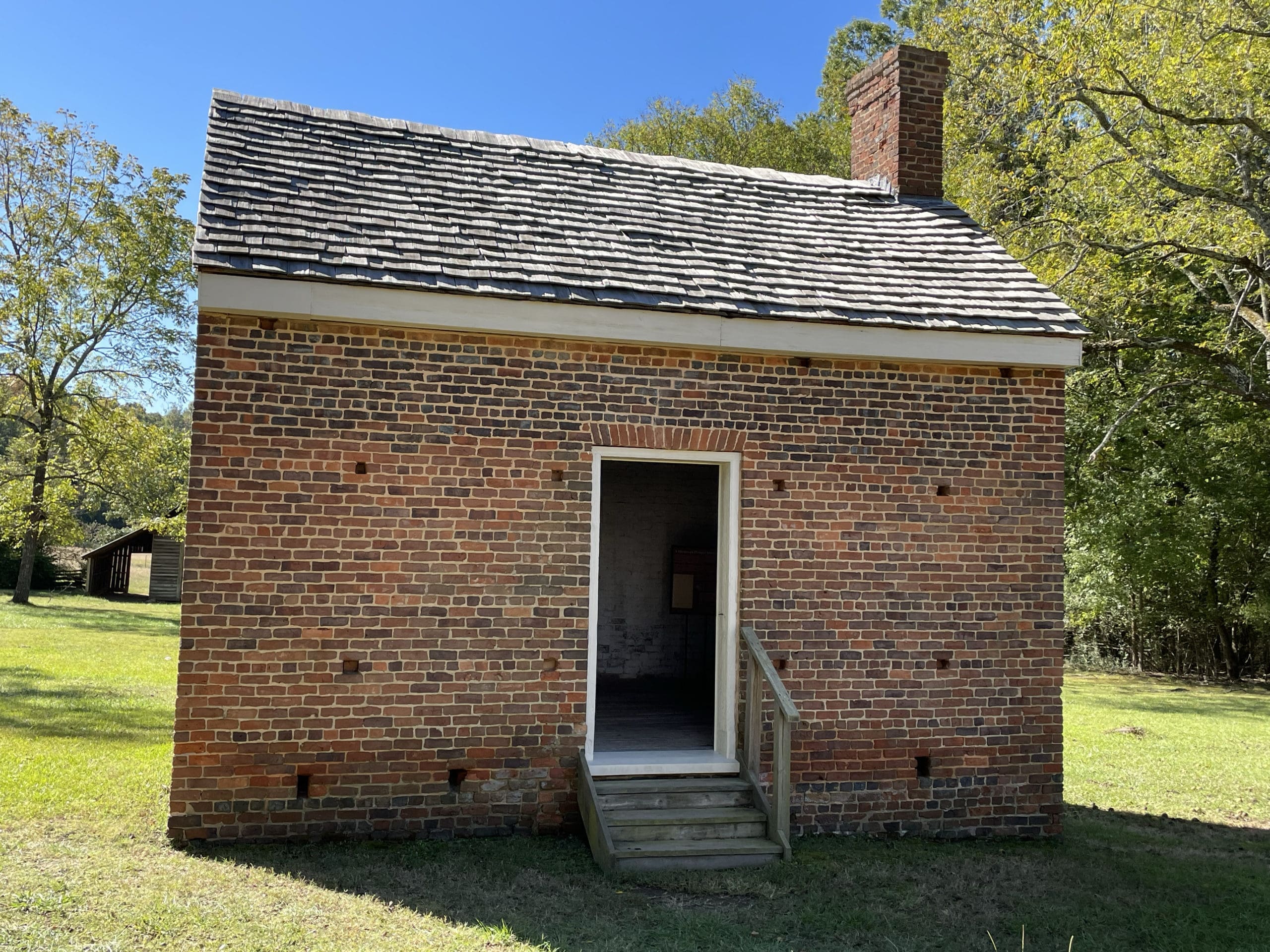 Visitors often question the holes in the structure’s walls. These openings were for “putlogs,” short pieces of lumber inserted through the holes to support scaffolding during construction of the building. On better houses, these openings were filled with brick after construction, but on outbuildings and slave dwellings they might be left open.