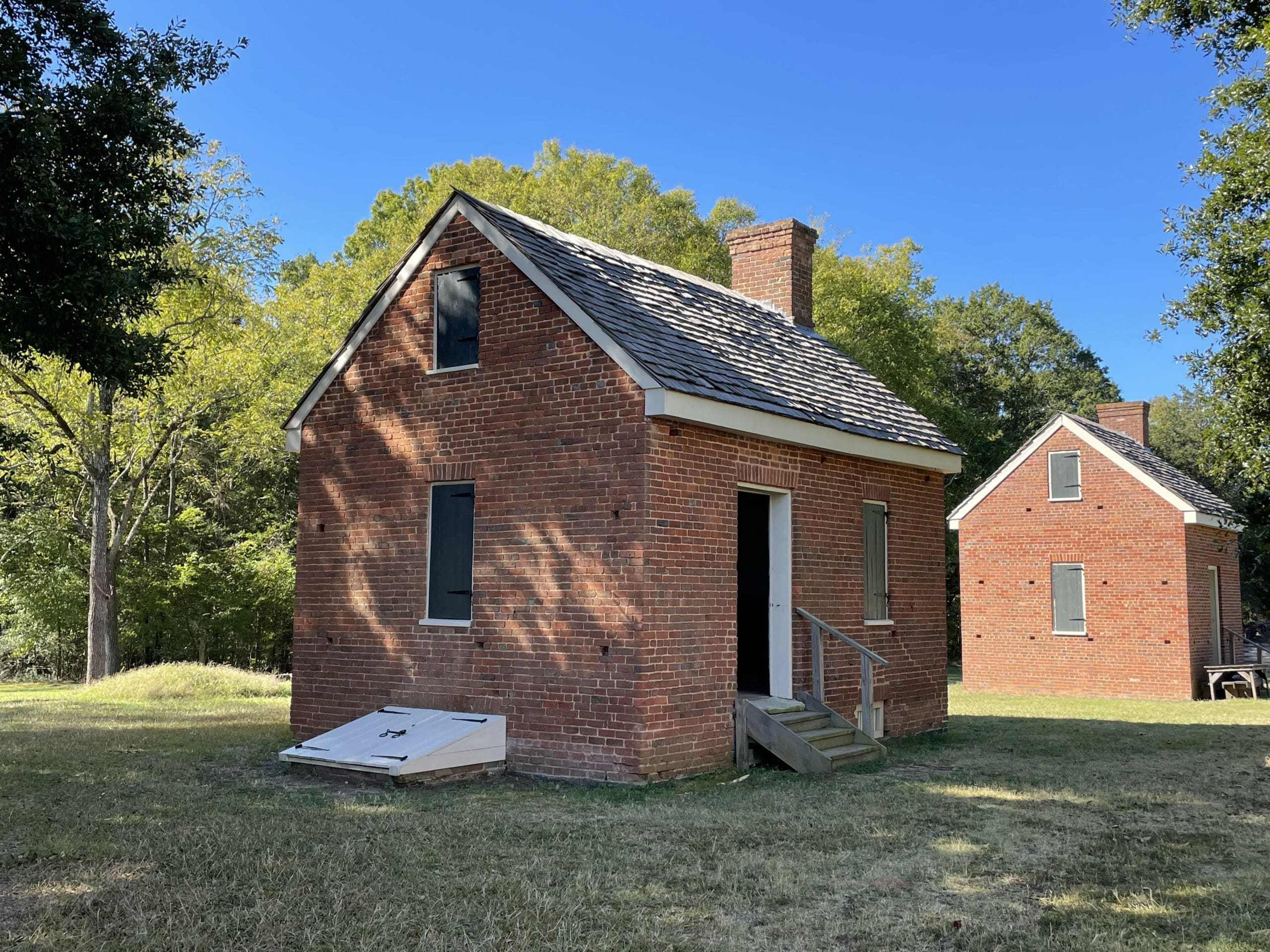 One of the three reconstructed brick slave houses, the kitchen was rebuilt on the foundations of the original structure following the completion of archeological investigations in the 1990s. This building would have been a beehive of activity as the center of food preparation for the Bratton family in the 19th century. The enslaved cooks were highly skilled and capable of creating elaborate meals for the Brattons and their visitors. Aside from serving as a workspace, it was likely the home of the enslaved cook and their family.